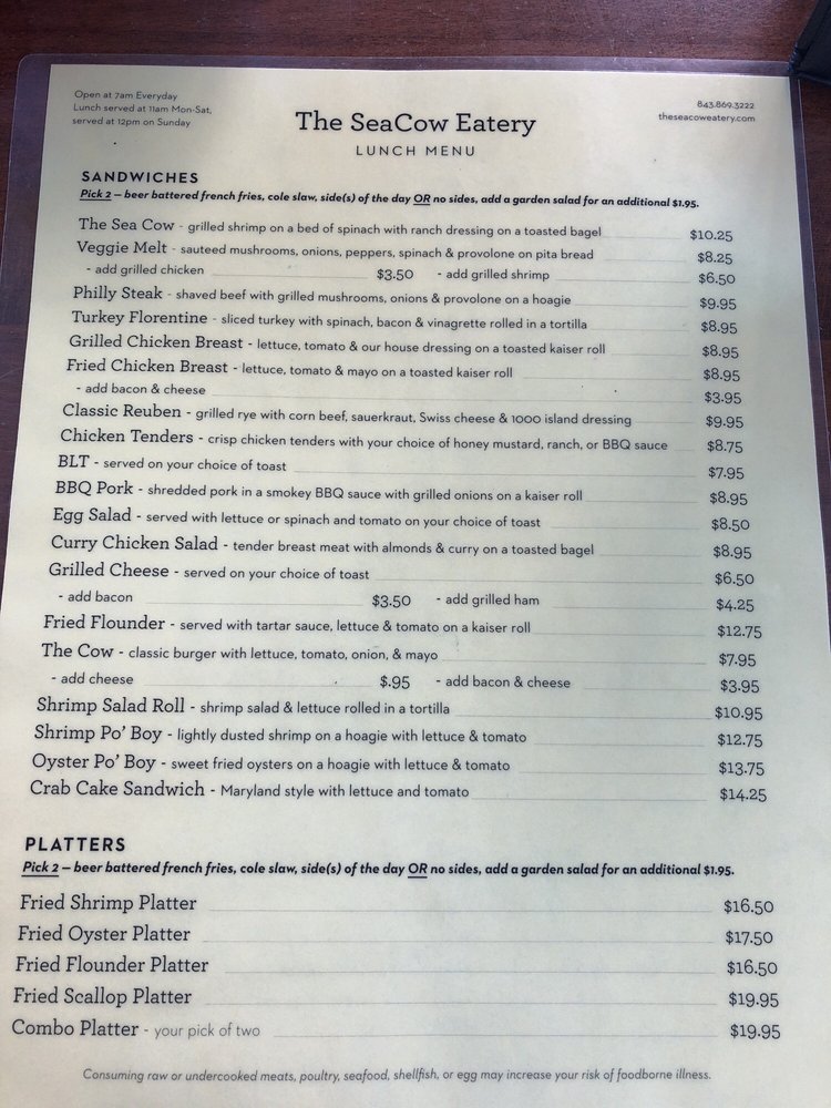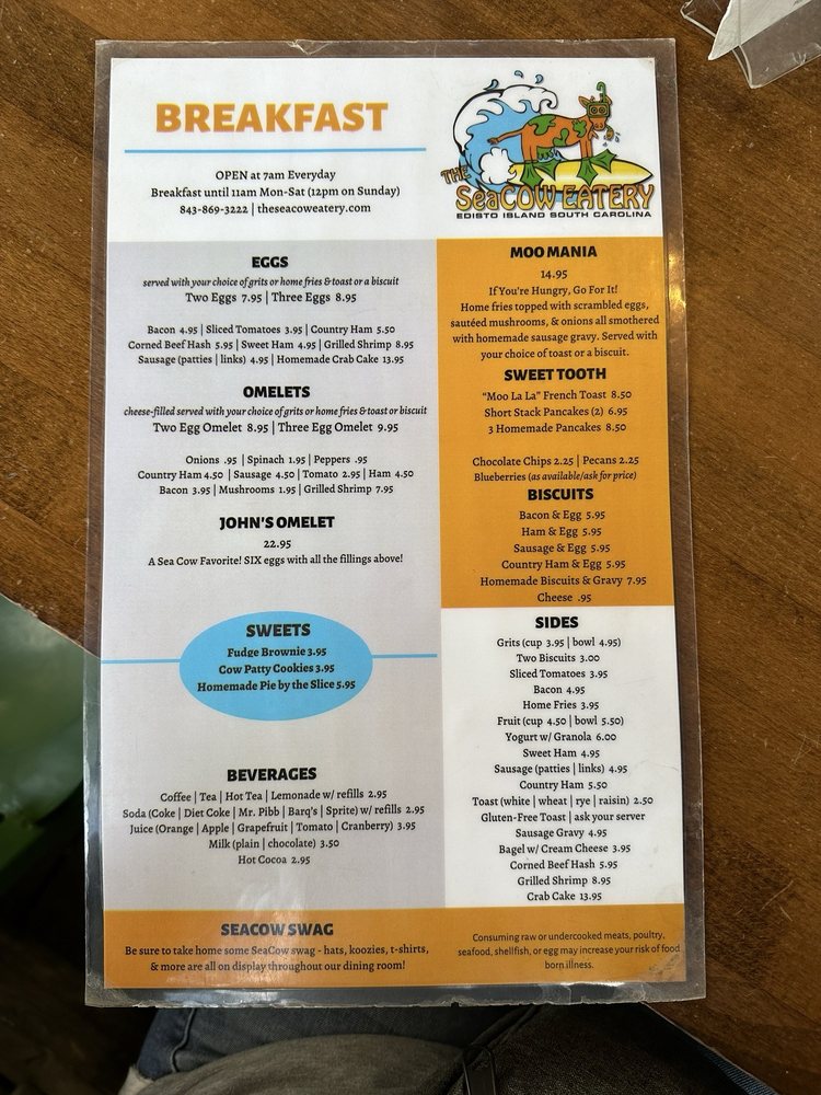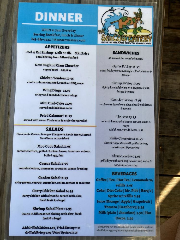 SeaCow Eatery is a popular American-Seafood restaurant located in Edisto Beach, SC. Known for its great service and diverse menu options, SeaCow offers a range of dishes suitable for breakfast, brunch, and lunch. The menu includes many vegetarian options and features dishes like Fried Steak with mushroom brown gravy, Fisherman's Platter with oysters and shrimp, and Fries Shrimp and Flounder. The atmosphere is welcoming, with options for outdoor seating, private dining, and heated outdoor seating. Customers have praised the food quality and friendly staff, making SeaCow a must-visit destination in the area. With various amenities like takeout, delivery, and catering services, SeaCow Eatery ensures a delightful dining experience for all visitors.